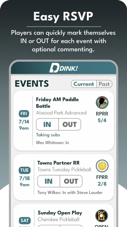 - User-Friendly Scheduling: Players can easily mark themselves as "in" or "out" for each event, ensuring accurate attendance planning and eliminating any last-minute surprises.