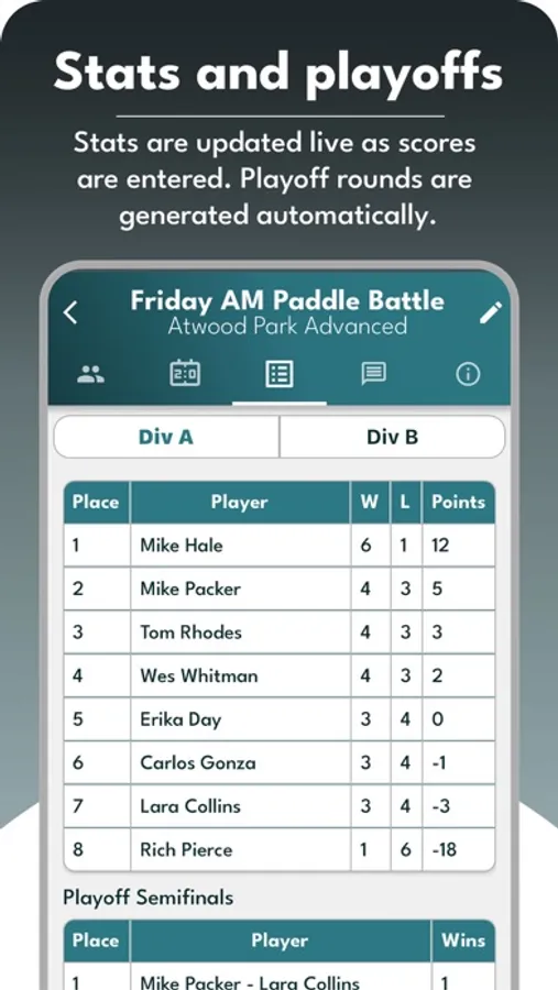 - Playoff Rounds: Have playoff rounds for your events with automatic seeding and round creation. Add quarterfinals, semis, and finals to your events to increase the stakes!