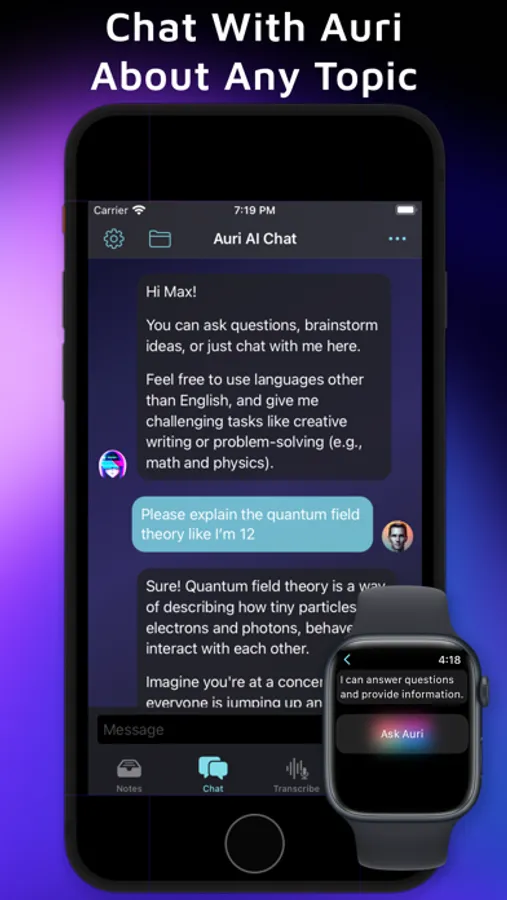 Choose between 15 different chat types and two engines. Save chats, share messages, use voice to type, and more.