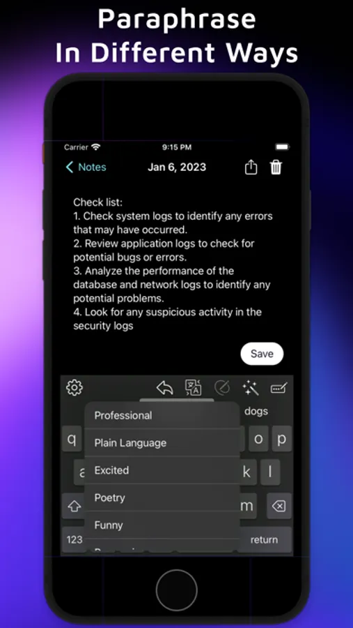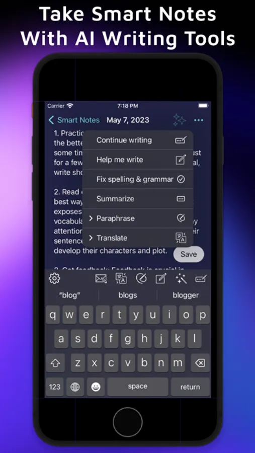 You can easily create and store your notes in the app with access to AI writing tools: Check Grammar and Spelling, Help Me Write, Continue Writing, Translate, Summarize, Paraphrase, and more!