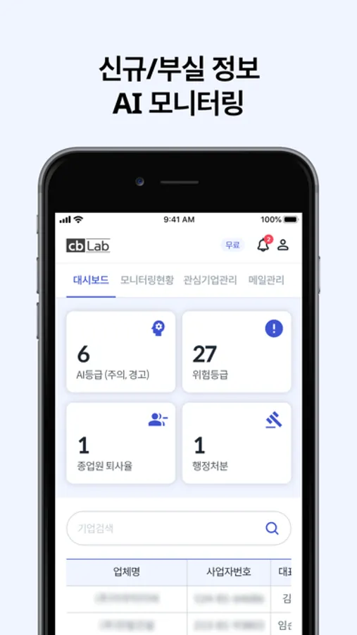 * 거래처 모니터링 관심기업 등록 시 신규/부실 정보 실시간 알림 신뢰할 수 있는 AI 데이터를 바탕으로 사전 예측 모니터링 제공
