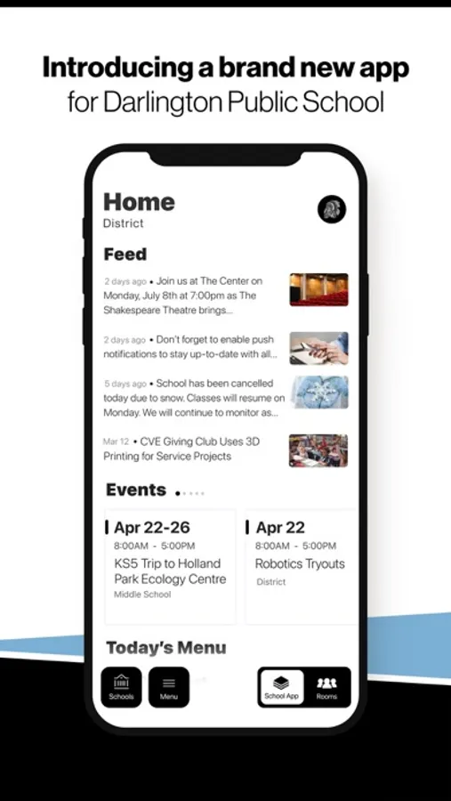 The event section shows a list of events throughout the district. Users can add an event to their calendar to share the event with friends and family with one tap.