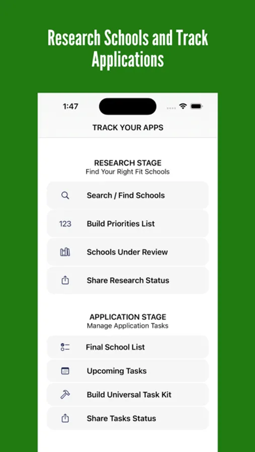 TRACK MY APPS helps you research schools to narrow down the right schools for you; then stay on top of all the tasks you need to complete your college applications.