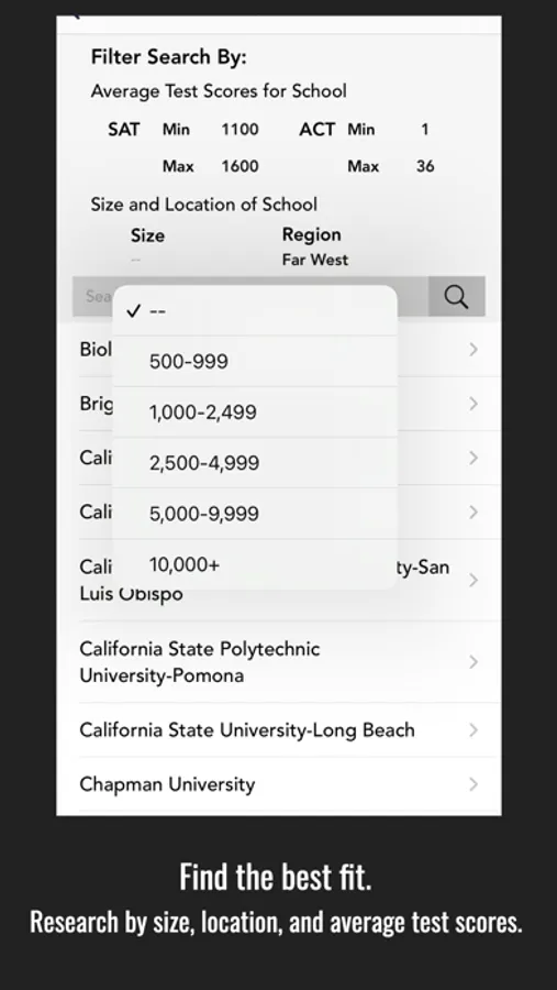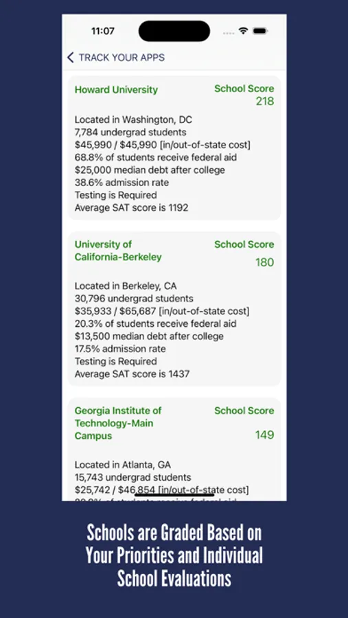 Research schools before adding them to your list. Filter by location, size, and average test scores. When deciding between schools, start by setting your priorities, then grade the schools you're researching. TRACK MY APPS will then provide an overall score for each school.
