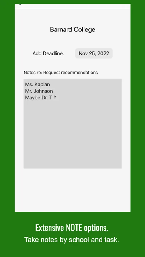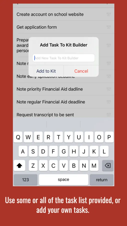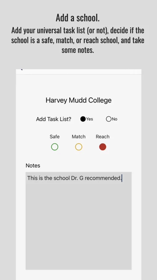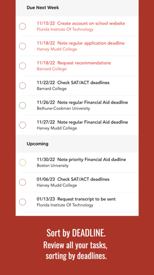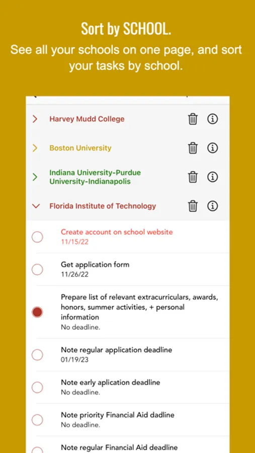 Once you've decided which schools you want to apply to, build a universal task list to use with each school. Use some or all of the available tasks, or add your own. Add the schools to your list, add deadlines, and take notes. Track by school or deadline.