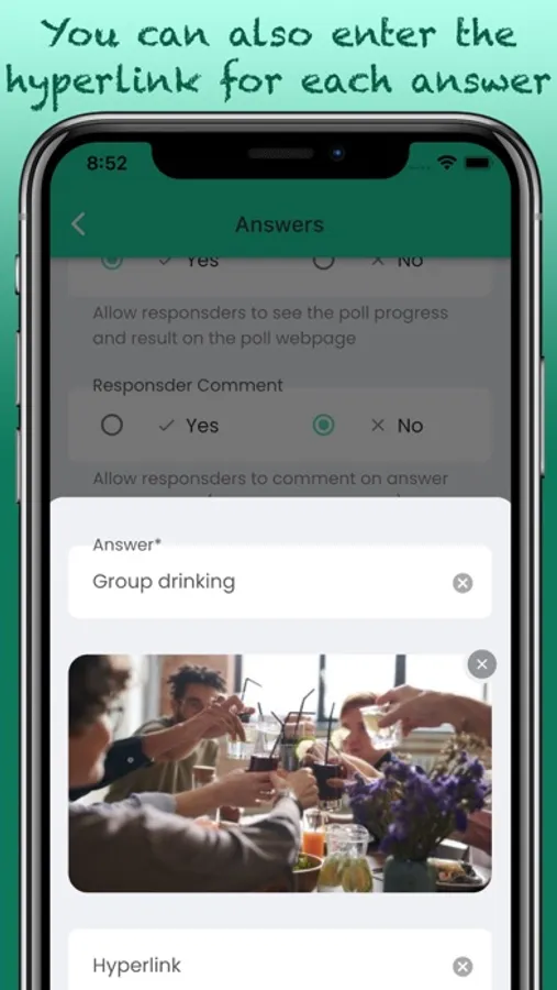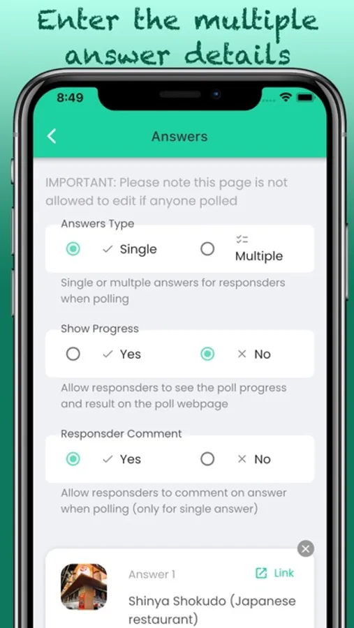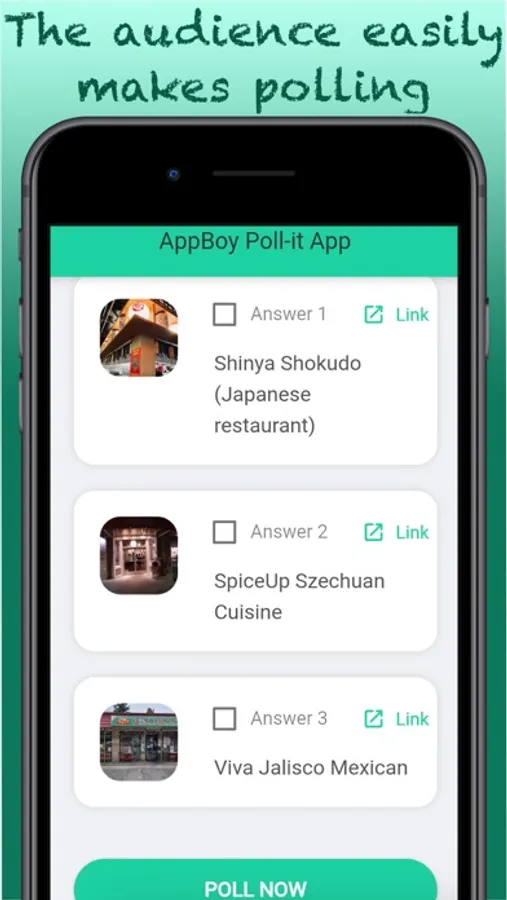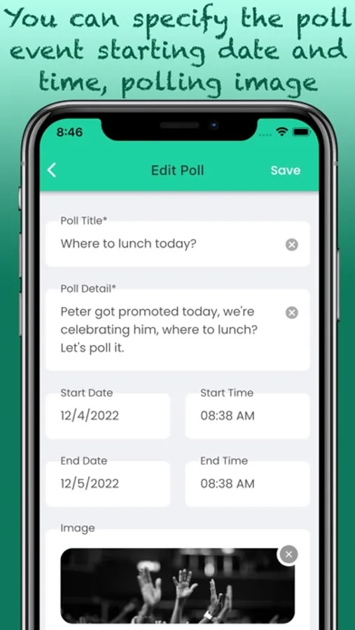 Build your polling with options, and images. Two polling modes support: invite (for specific audiences) or open (for public). You can define polling start & end time.