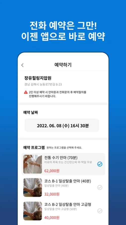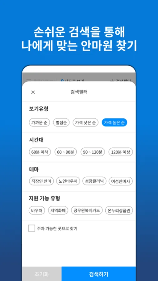 - 직장인 안마, 노인 바우처, 산모 바우처, 성장클리닉, 여성안마사 등 나에게 맞는 테마 설정으로 맞춤 서비스를 쉽고 빠르게 예약