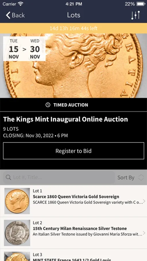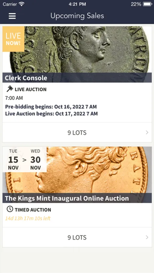 With The Kings Mint app, you can preview, watch and bid in our auctions from your mobile / tablet device. Participate in our sales while on-the-go and gain access to our following features: