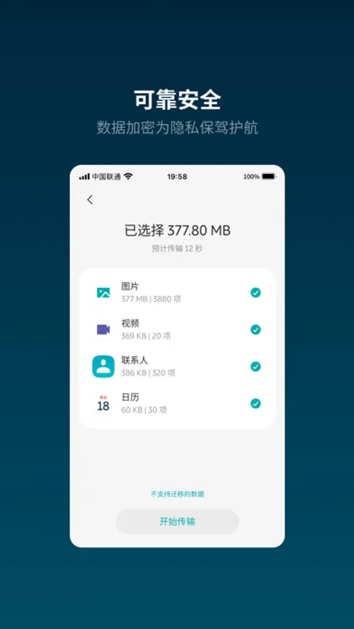 Obtain the data on the old device, including pictures, videos, contacts, and calendar. You can select what data to be transferred.