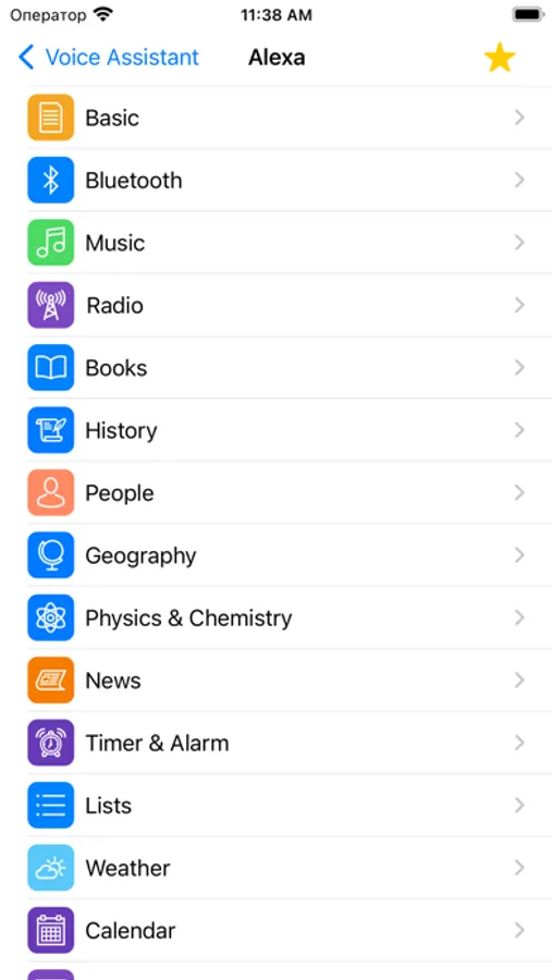 Basic. Device's settings. Music and Radio. Calculator. Facts. Weather. Calendar. Timer and Alarm. Notes and Reminders. News. Navigation. Driving. Translations. Calls and Messages. Apps. Smart Home. Easter Eggs.