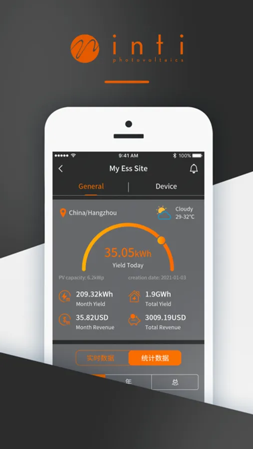The INTI App offers you a professional monitoring and management of your photovoltaic system. You can always keep an eye on your energy storage system data conveniently and easily. With the functions of site operation status display, equipment failure alarm, data query and electricity statistics and so on, App allows you to know the running status of the equipment anytime and anywhere.