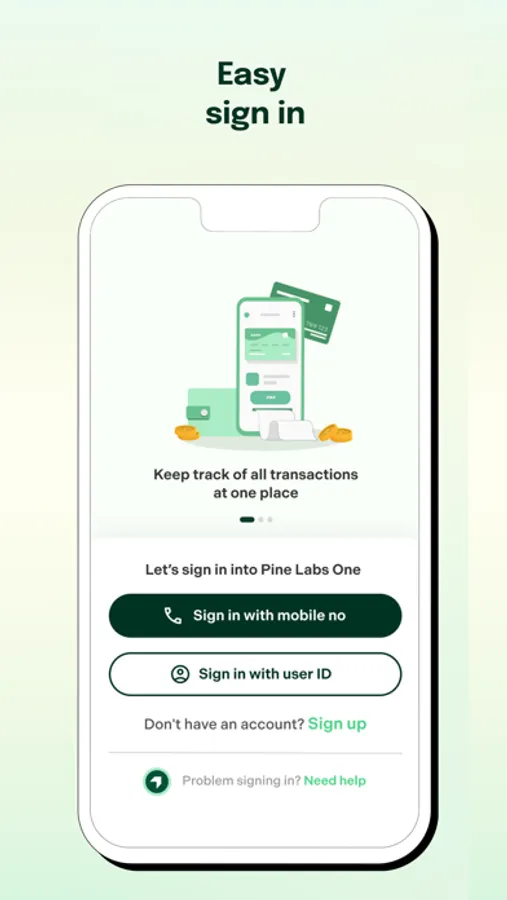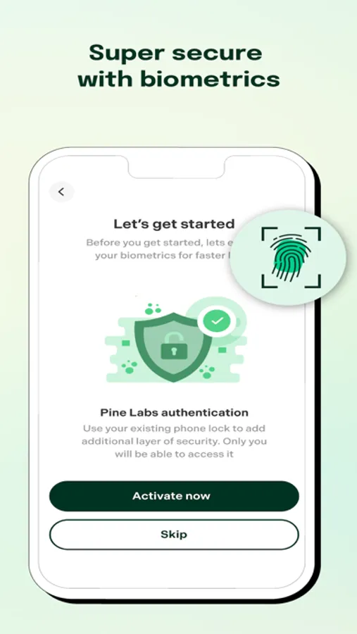 Signing in is quick and simple, using just your phone number and password. If you are an existing myPlutus user, your existing login credentials will work on Pine Labs One. You can also secure the app with your fingerprint lock.