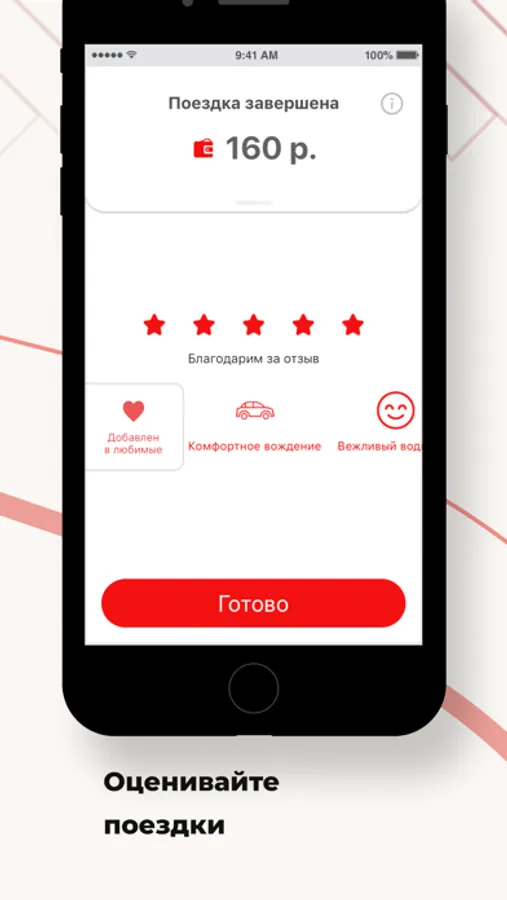 Оценивайте поездку с помощью готовых шаблонов. Занесите водителя в “Избранные”, если понравилась поездка.