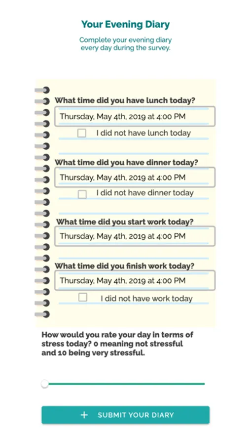 This app is for those taking part in a Biostress survey. The app allows you to record your daily survey diaries, any activities and any stressful events you might encounter during the day.