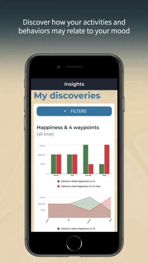 - Unlock interactive charts and filters that enable you to truly explore how your tracked behaviors may be relating to your mood
