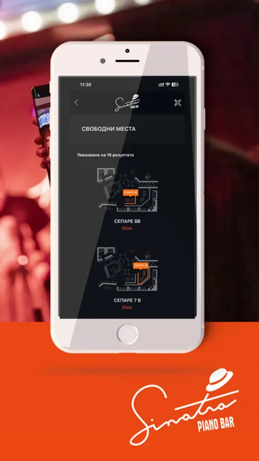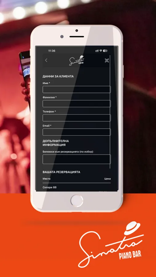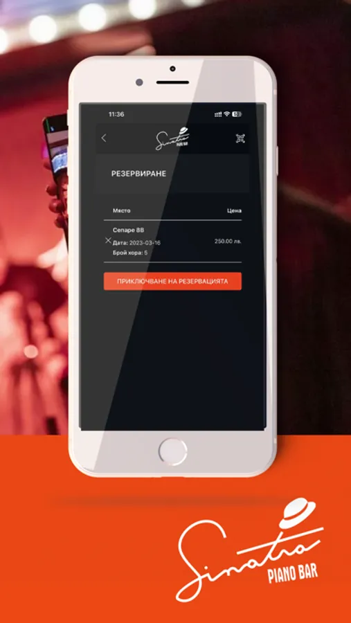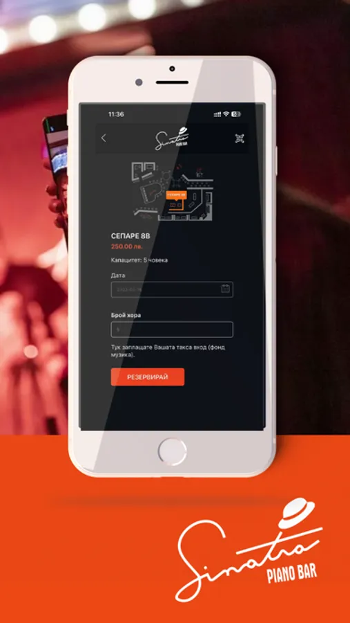 Чрез новото приложение на пиано бар Синатра, може да направите резервация за желано от Вас събитие или следващото Ви събиране с приятели. Може да изберете града, датата, броя хора, събитието и дори конкретно сепаре или маса в танцувалната зона.