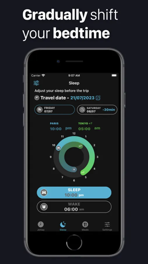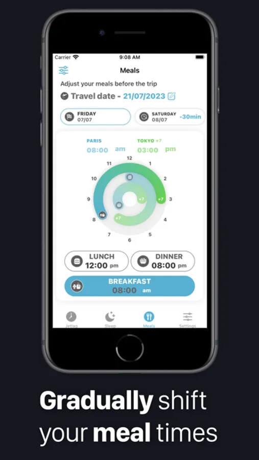 A few weeks before your departure, fill in a few simple parameters in the application. JETLAG will offer you a personalized schedule to gradually shift your bedtime, wake up time and meals.