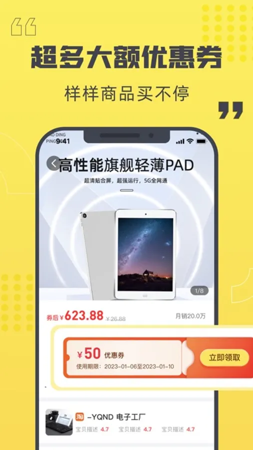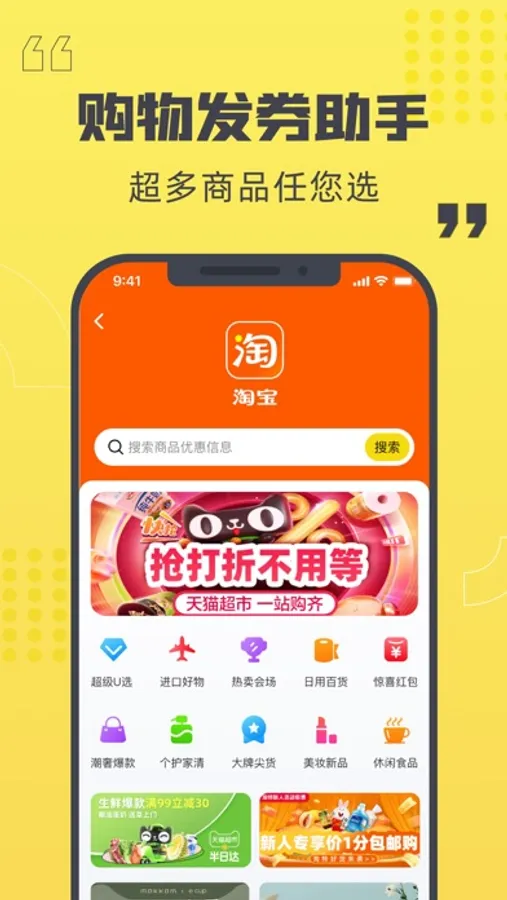 1.购物领取大额优惠券,超多商品任您选,叠加优惠再减,随时随地轻松购物;