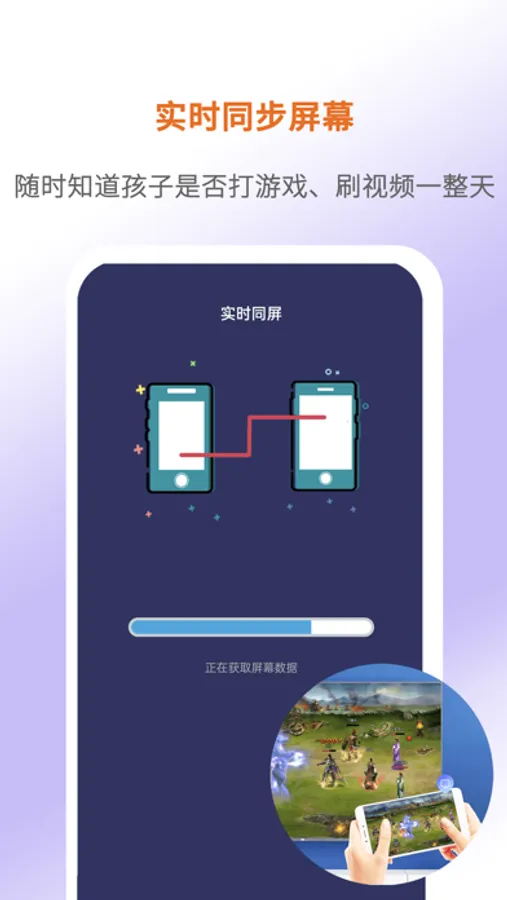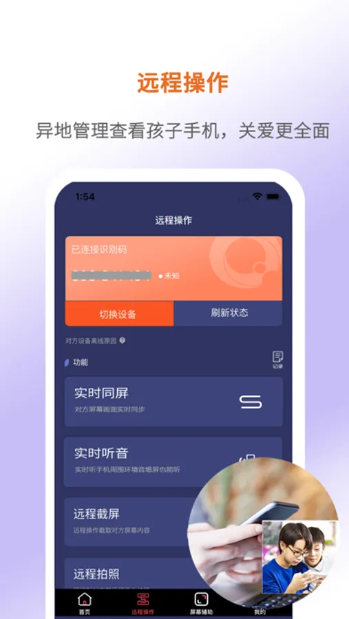 3. 【实时同屏】:远程同步家人好友的手机屏幕,适用于家长管理孩子,了解孩子是否正在使用手机打游戏,同屏期间可以进行录屏和截屏操作。