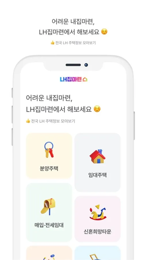 - 토지, 분양주택, 신혼희망타운, 임대주택, 매입임대/전세임대, 상가에 대한 정보를 쉽게 확인해보세요