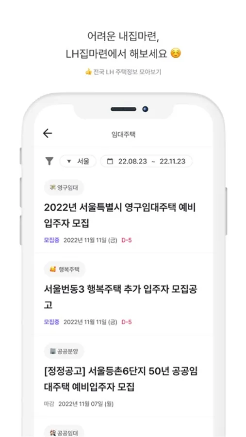 - 공공분양, 행복주택, 국민임대, 공공임대, 영구임대 등 세부 카테고리도 쉽게 확인해요!