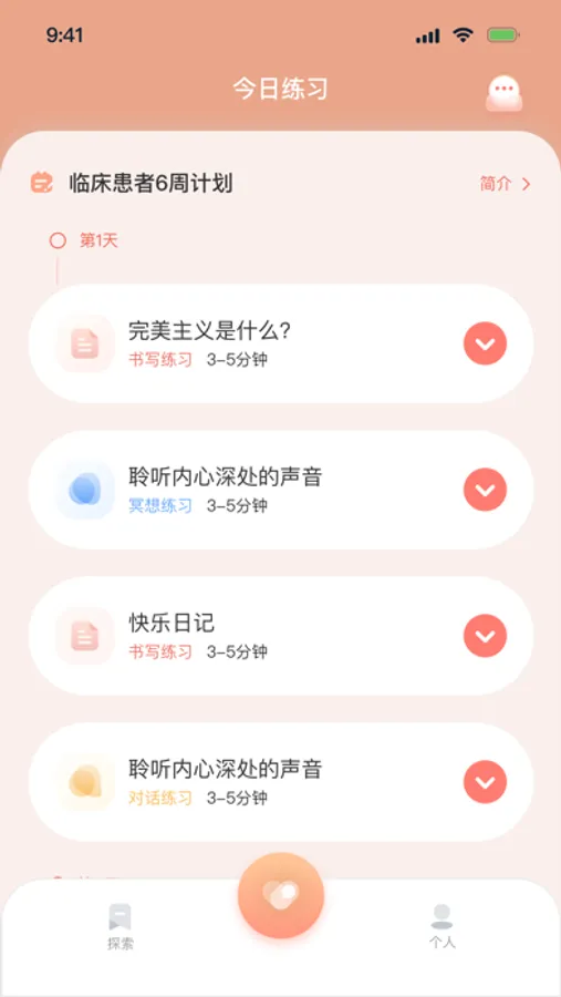 这里有冥想、科普、书写、主题对话等多种类型的练习内容供您选择
