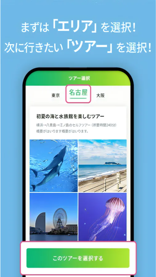 サイクリングやポタリングを楽しめるガイドアプリです。まずは「エリア」を選択してください。次に行きたい「ツアー」を選択。