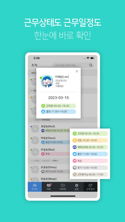 - APP 내 어느곳에서든 나와 동료들의 상세 근무일정 바로 확인 가능