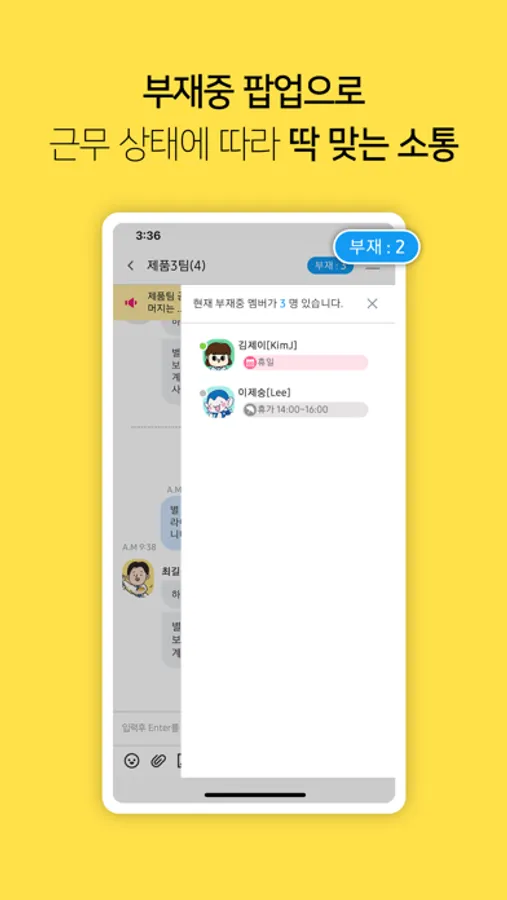 - 대화방에 휴가,휴일,근무 시간이 아닌 멤버 부재 알림