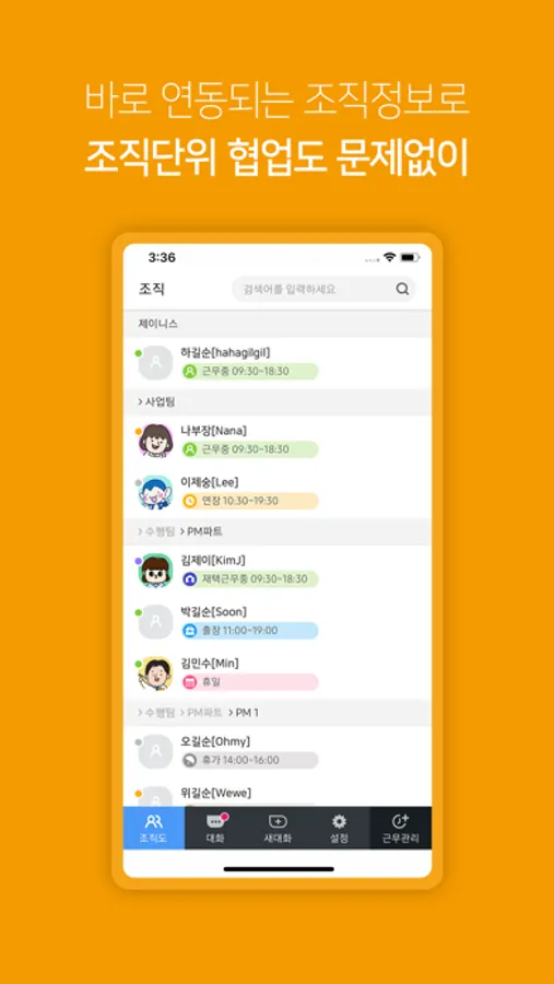 - 유연근무•재택근무 등 설정한 근무유형에 따른 근무정보 노출