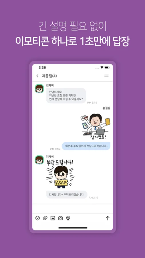 - 직장 생활 중 생기는 다양한 상황에서 이모티콘으로 1초만에 답장
