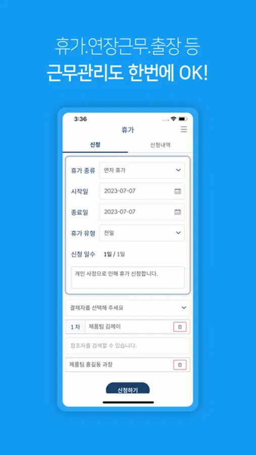 - APP에서 휴가,연장근무,출장 신청 바로 가능