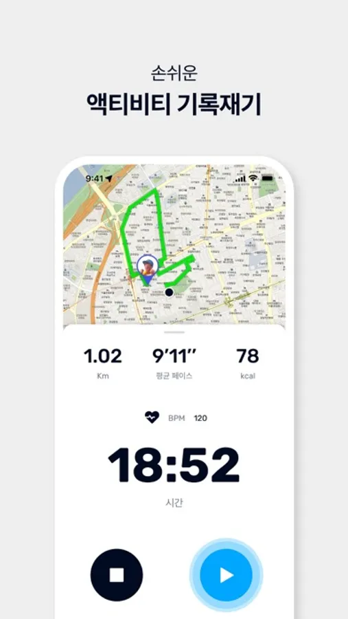 GPS를 이용하여 위치와 걸음, 칼로리, 운동시간 등의 정보를 제공합니다.