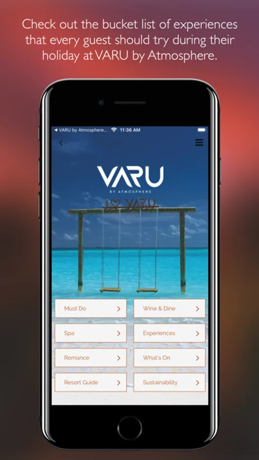Explore VARU by Atmosphere and its stunning facilities, plan your visit and activities from your device before and during your visit. Use this App to start planning your stay, and ensure you don’t miss-out on any of the incredible experiences on offer at VARU. Complete the check in formalities before you arrive, direct from the App. During your stay the App provides the perfect travel companion, showing your itinerary, what’s on and providing you with inspiration from the must-do experiences. It even allows you to start planning your return visit.