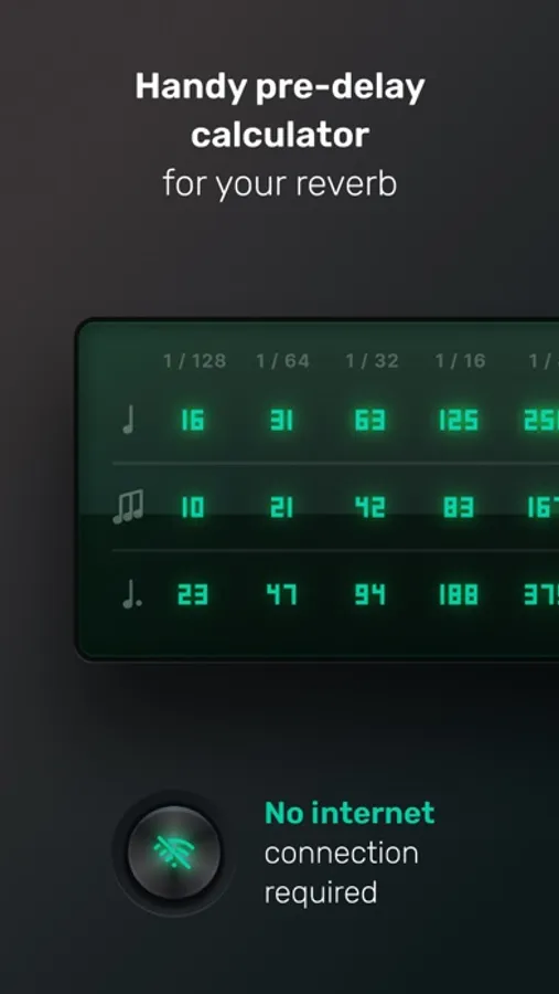 In their work, the sound engineer and composer have to find the music delay time required to tune the sound processing. The Delay Calculator & Metronome automatically calculates delay times in milliseconds for whole notes, dotted notes, and trios by setting the BPM (Beats Per Minute) value. Quickly find values for your reverbs and delays!