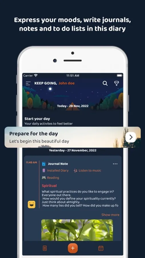 - Add your journal note with multiple activities like reading, listening to music, working, etc. You can create your custom activities as well.