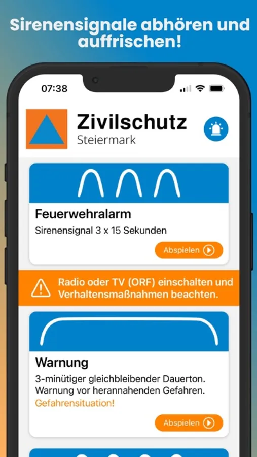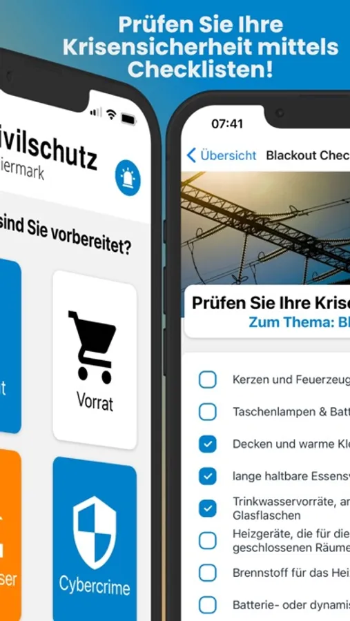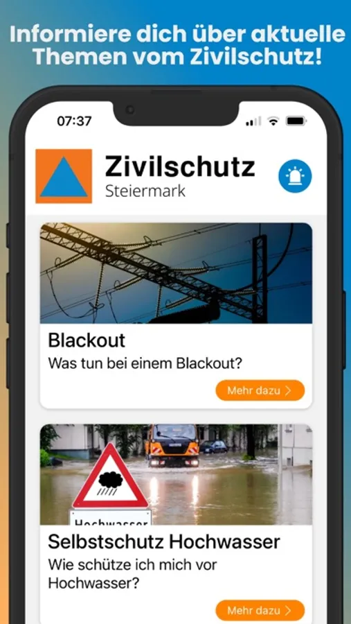 Mit der App des steirischen Zivilschutzverbands können Sie sich zu den aktuellsten Zivilschutzthemen wie Blackout, Hochwasser, Bevorratung und Cybersicherheit informieren. Zusätzlich gibt es zu jedem Thema eine Checkliste. Auch die verschiedenen Sirenensignale können in der App abgespielt werden. Über die Info-Seite können Sie Kontakt zu uns aufnehmen.