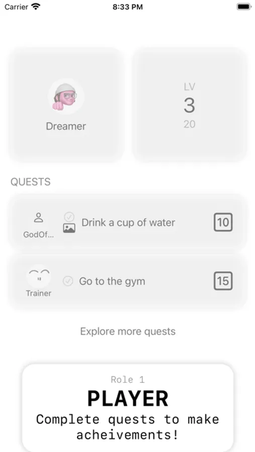 Player : It is a role that carries out a quest, represents you completing quests and achieving daily achievements. The player's level will show your growth.