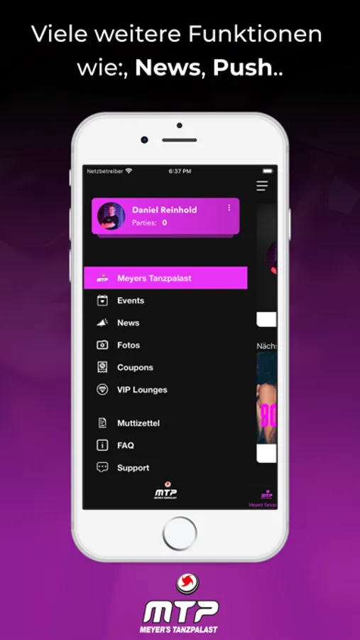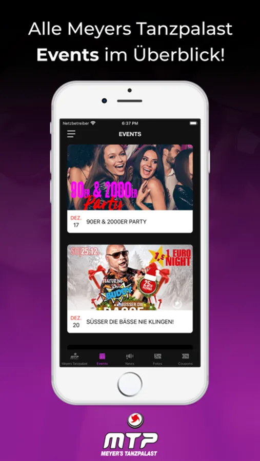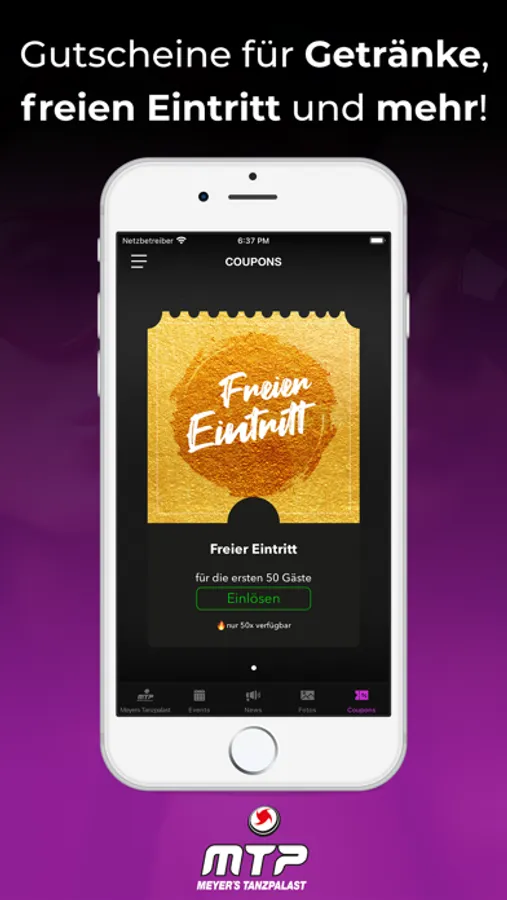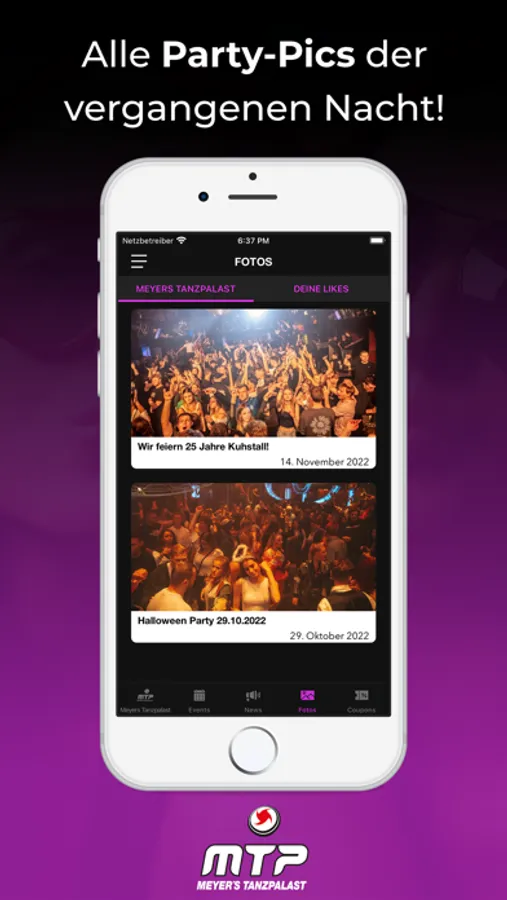 Du erfährst als erster, wann die nächste Party steigt und profitierst dabei noch von fetten Aktionen. Zum Event sparst du mit unseren Gutscheinen bares Geld. Damit du dich am Tag danach auch an den geilen Abend erinnern kannst, stellen wir alle Party-Pics in der App bereit.