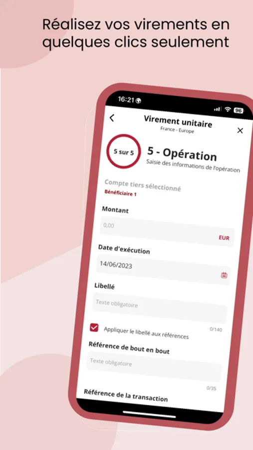Réalisez vos opérations en quelques clics seulement. Pas de fonctionnalités cachées ou superflues. Que ce soit pour l’affichage des comptes, le suivi et l’historique des opérations, pour effectuer un virement ou partager votre RIB, tout est accessible simplement et rapidement.