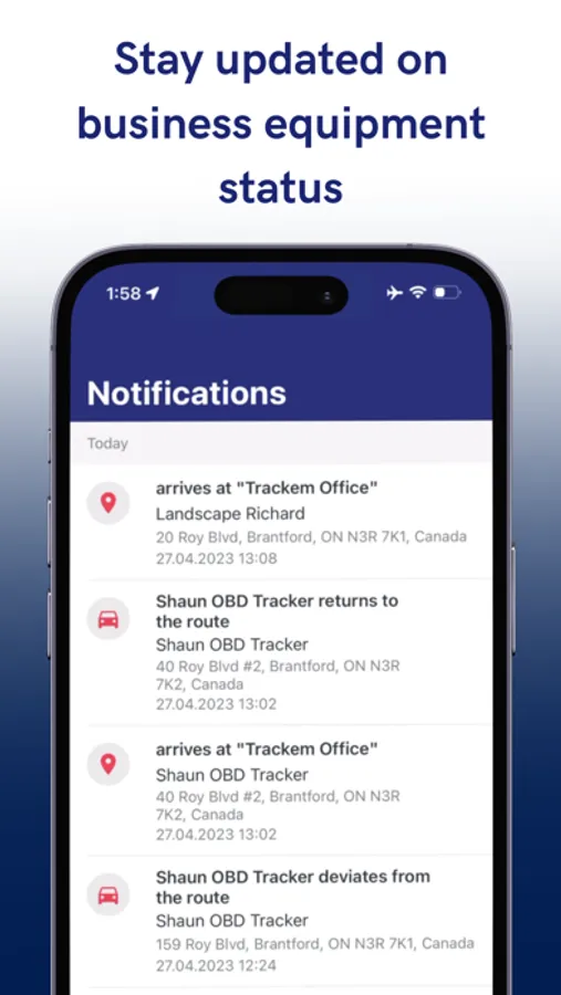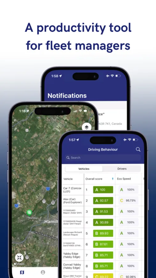- Receive immediate notifications about fleet vehicles and asset activity.