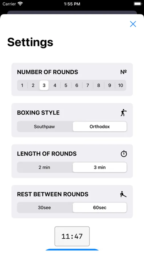 - multi round workouts, up to 10 round workouts where you get to control how long your rests are (30 or 60 seconds) and how long the rounds are (2 or 3 mins). Work all your way up to a 10 round workout with 3 minute rounds and 30 second break for the ultimate workout!!!!