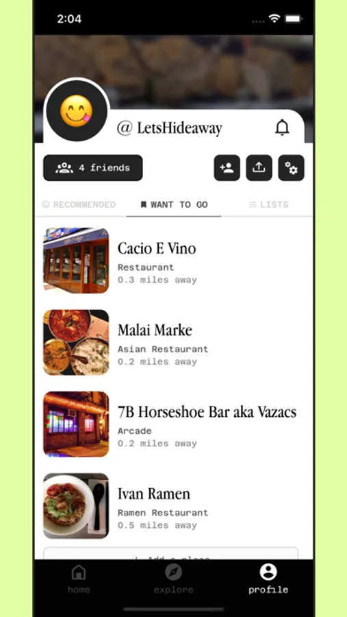 Hideaway is the ultimate recommendation app that takes the guesswork out of finding the best places and experiences. Say goodbye to unreliable reviews and hello to trusted recommendations from your friends. With Hideaway, you can easily discover the best local hotspots, hidden gems, and must-try dishes, all tailored to your preferences. Whether you're looking for a romantic date spot or a lively happy hour, our curated playlists have you covered.