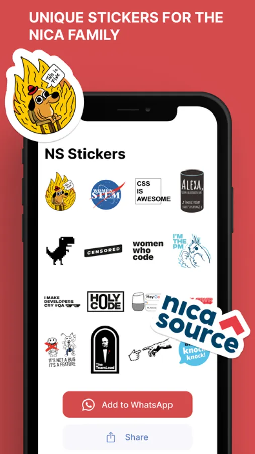 The Nicasource stickers pack App purpose is to provide funny images for developers and tech workers for their day-to-day interactions. The shared stickers relate to our activities and the company's culture, but can also be used by everyone for free, share your favorite stickers with IT crowd members or anyone with a sense of humor.