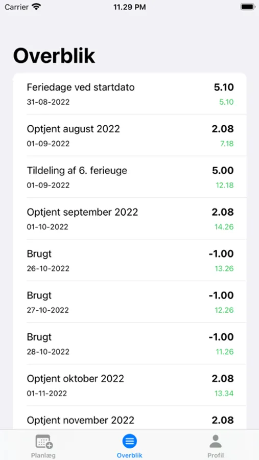 - Få det fulde overblik over alt brugt og optjent ferie.