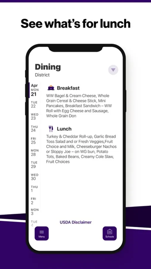 Within the dining section, you'll find an easy to navigate, weekly menu, sorted by day and meal type.