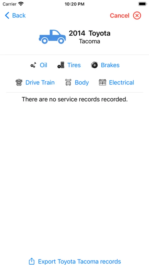 Tap on the vehicle record row in the main home screen, which takes you to the “Service Records” screen, and choose the service component by tapping on Add Service Record. Service Records are listed by date, the newest at the top—swipe left on a record to delete the record from the database.