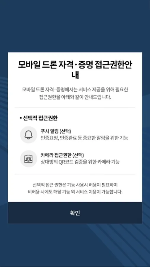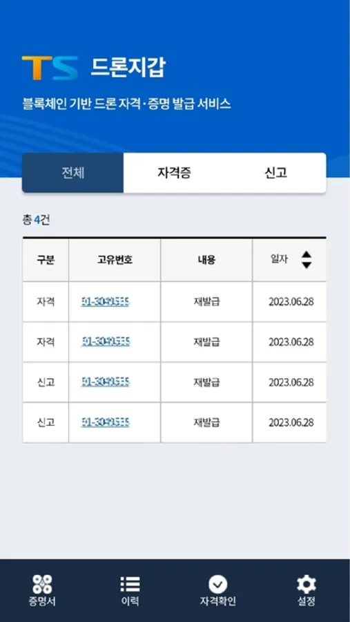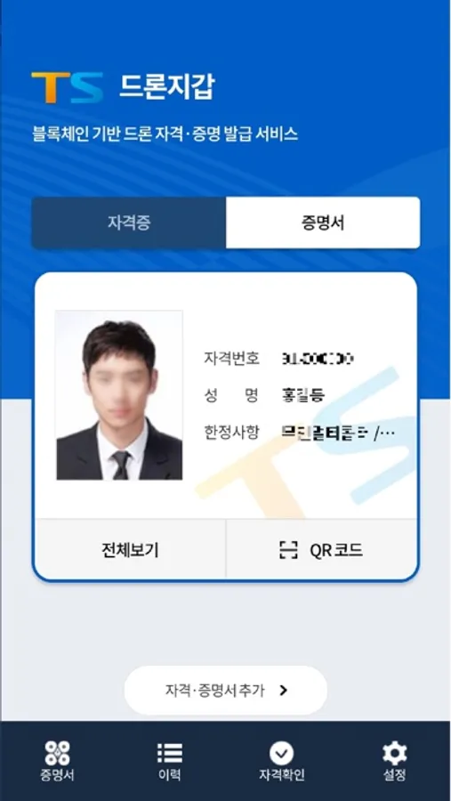 블록체인과 DID 기술을 활용하여 인증된 드론 조종자격 증명서, 드론 기체신고 증명서, 드론 사용사업체신고증명서를 전자지갑 앱에 DID 기반 자격증을 보관하고, 필요시 자격증을 QR과 블록체인 기반의 DID 기술을 활용하여 인증 서비스를 제공하는 앱
