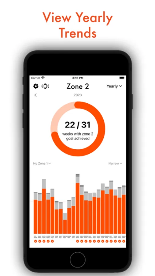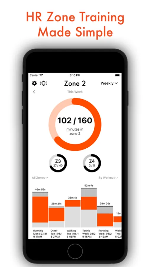 Zone 2 helps you track how much of your weekly workout time is performed in the zone 2 heart rate range. It is recommended that 80% of your workout time is spent in this zone.