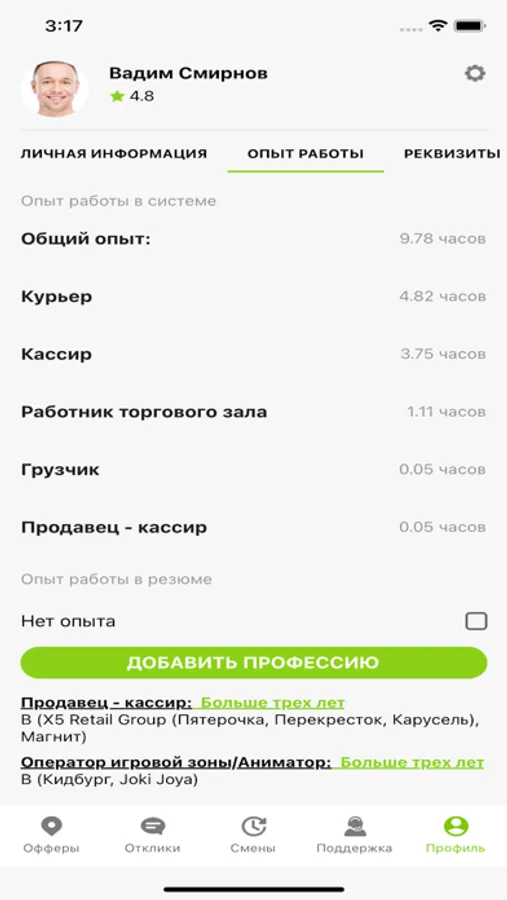 А еще наше приложение похоже на компьютерную игру, где у вас есть опыт работы, который постоянно увеличивается после каждой смены, еще есть репутация, и если она будет высокой, то вы получите доступ к самым крутым предложениям и топовым работодателям. В будущем на основе вашего опыта и репутации, вы будете зарабатывать гораздо больше, потому что те у кого больше опыта - больше заработок. Просто, до нас никто это так тщательно не считал!